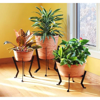 - WROUGHT IRON STAND: The design of this planter stand is elegant in its simplicity, with two thick flat pieces fitting together to form a strong crossbar at the center of the stand, made of wrought iron and coated in black powder for a weather resistant finish