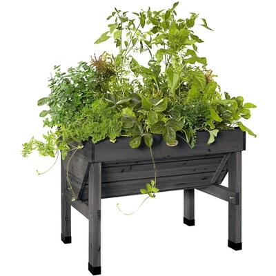Grow plants at an easy working height in this unique patio garden; no bending or kneeling to plant, tend and harvest. The compact size is ideal for smaller spaces, and the elevated bed means no weeds and fewer pests, too. The V-shape makes efficient use of space and planting mix — grow deep-rooted plants like tomatoes in the center, shallow-rooted crops like salad greens along the edges. Includes a fitted fabric liner to keep soil contained while letting excess water drain. Plastic feet protect wood from wet surfaces. Quality construction and easy assembly.