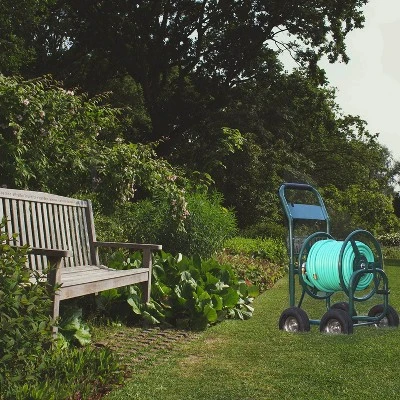 Keep the grass green on both sides of your yard, with Liberty Garden Products 4-Wheeled Garden Hose Reel Cart.Pneumatic tires keep your cart safe from any nibbling creatures that crawl into your yard, while the 5-foot leader hose with 90-degree brass swivel connector allows you to water from gate-to-gate with ease. Made of durable, 13-gauge steel powder coated construction with all brass and galvanized fixtures, this cart will last all year long.You can use the included storage basket to hold your gardening tools or your mid-chore snack. Stop risking an injury from tripping over a hose, and keep order to avoid a messy looking yard with a Garden Hose Reel Cart from Liberty Garden.