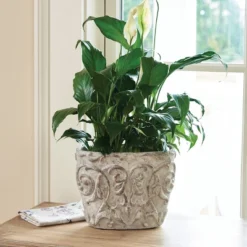 Display your favorite plant in an intricately detailed pot. Features a white aged overall look with carved out swirls and vine inspired designs. Made of cement, this piece captures the beauty of nature in a beautiful manner to adhere to a simple design. The antique look adds to the overall appeal that will make a great addition to countryside home styles for all seasons.