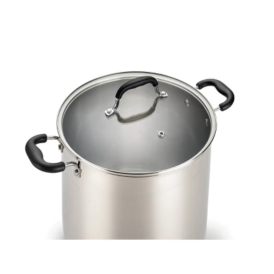 The T-fal Stainless Steel 12-qt. Stockpot is a stylish and functional addition to any kitchen. This stock pot features a tempered glass lid with a stainless-steel finish and air vents that allows the steam to escape. The black silicone handles provide great strength and a firm support. The 3-ply aluminum construction distributes heat evenly to the cooking surface and prevents the formation of hot spots. It is compatible with gas, electric, and glass stove tops. The 12-qt. Stockpot has a capacity of 12 quarts and is dishwasher safe, enabling easy cleaning.