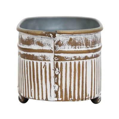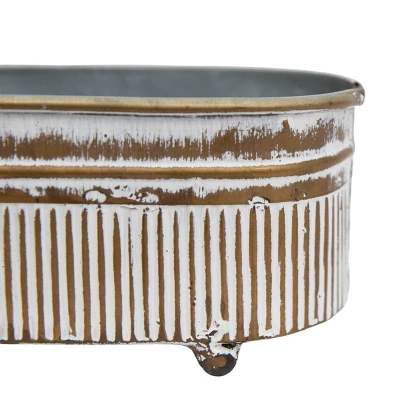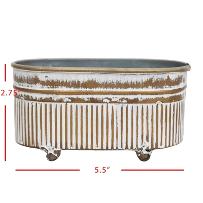 Inspired by vintage farm troughs, this planter is the perfect modern rustic accent for any space in your home. A mini planter that can be used as a soap dish, a cute way to hold your sponge at the kitchen sink or filled up with your favorite seasonal greenery. With a brass washed metal finish and embossed ticking pattern covered in a distressed white rub, it is the perfect addition to your rustic style home.