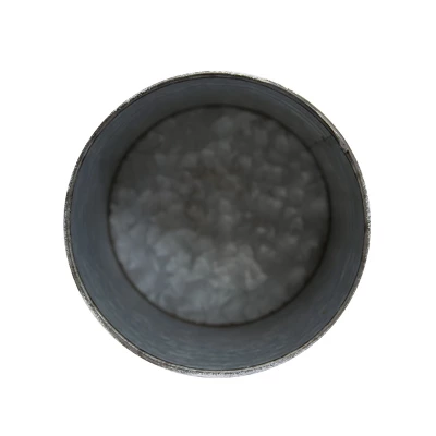 Looking for a planter that is neutral but not boring? This one will add dimension to your space, while its subtle coloration enhances your greenery. The galvanized charcoal metal planter with a clean rolled edge is distressed with a light white washing to accentuate the ribbed texture. Great multifunctional planter that can double as storage or a decorative accent. Make a statement in any modern farmhouse or traditional decor setting.